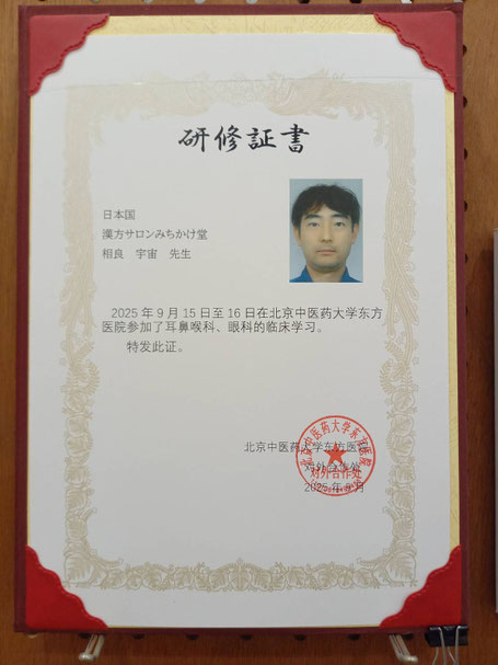 2025年9月15日~9月16日の研修をおさめたので終了証書をいただき、店内に飾っています
