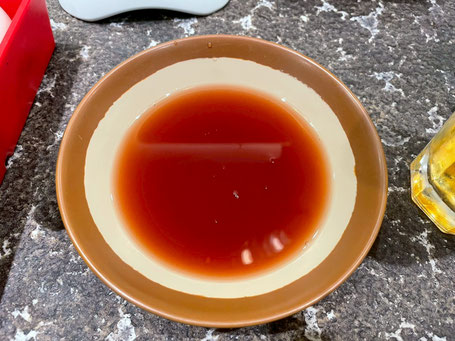 小皿のワインの様な液体は、自家製の烏梅湯で、のど鼻粘膜によい飲料です