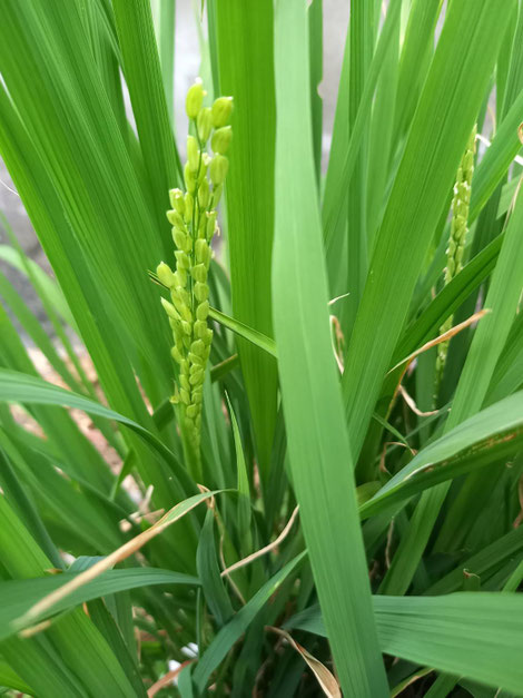 一粒のお米から緑色の葉が出て、それが伸びるとともに株が増えて、80cm程度になると茎から葉鞘にかけ太くなり、8月中旬現在で穂がたくさん出てきました