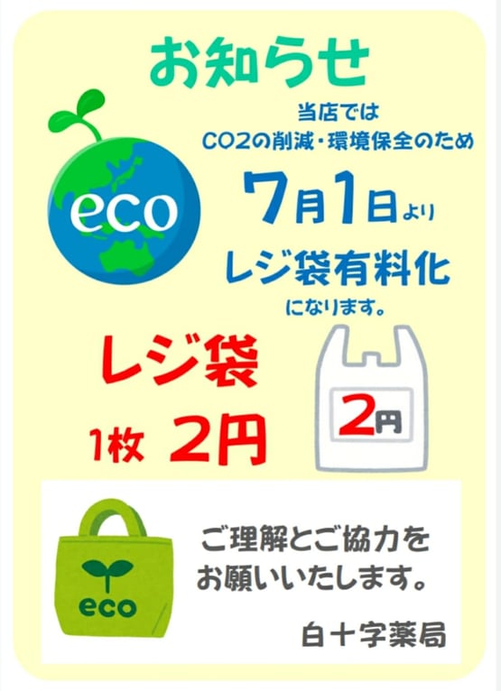 当店ではCO2の削減・環境保全のため7月1日よりレジ袋有料化になります。